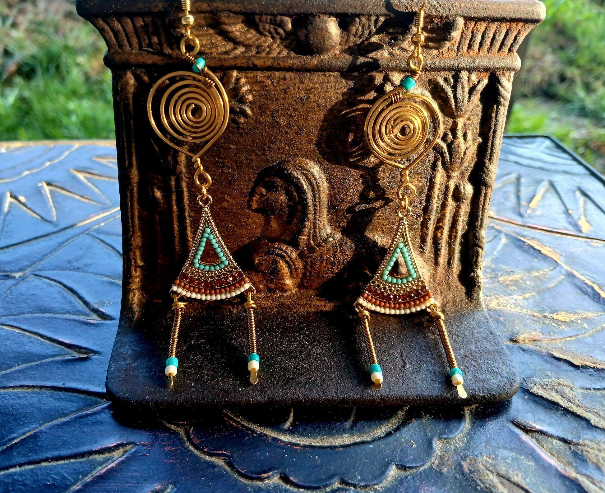 Handcrafted with deep reverence to the goddess within, this dainty pair of wire and glass earrings evoke a feeling of royalty, empowerment and beauty. It's a merriment of a tribal culture and elegance. The warm and cool colors of: turquoise, brown, sienna, white, and bronze embody the free-spirited rhythm of AfroBohemian style—where color tells a story, and artistry celebrates movement, culture, and individuality.