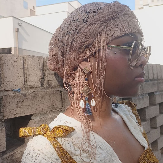 Come, let's travel to a place where exotic spices fill the air, the sun kisses the skin and the traditions are deep, meaningful and a way of life. This pair of earrings were assembled with antique gold diamonds, handspun tassels, indigo glass crowns and navy seed beads dangle lightly with the wind, with your graceful movements.
