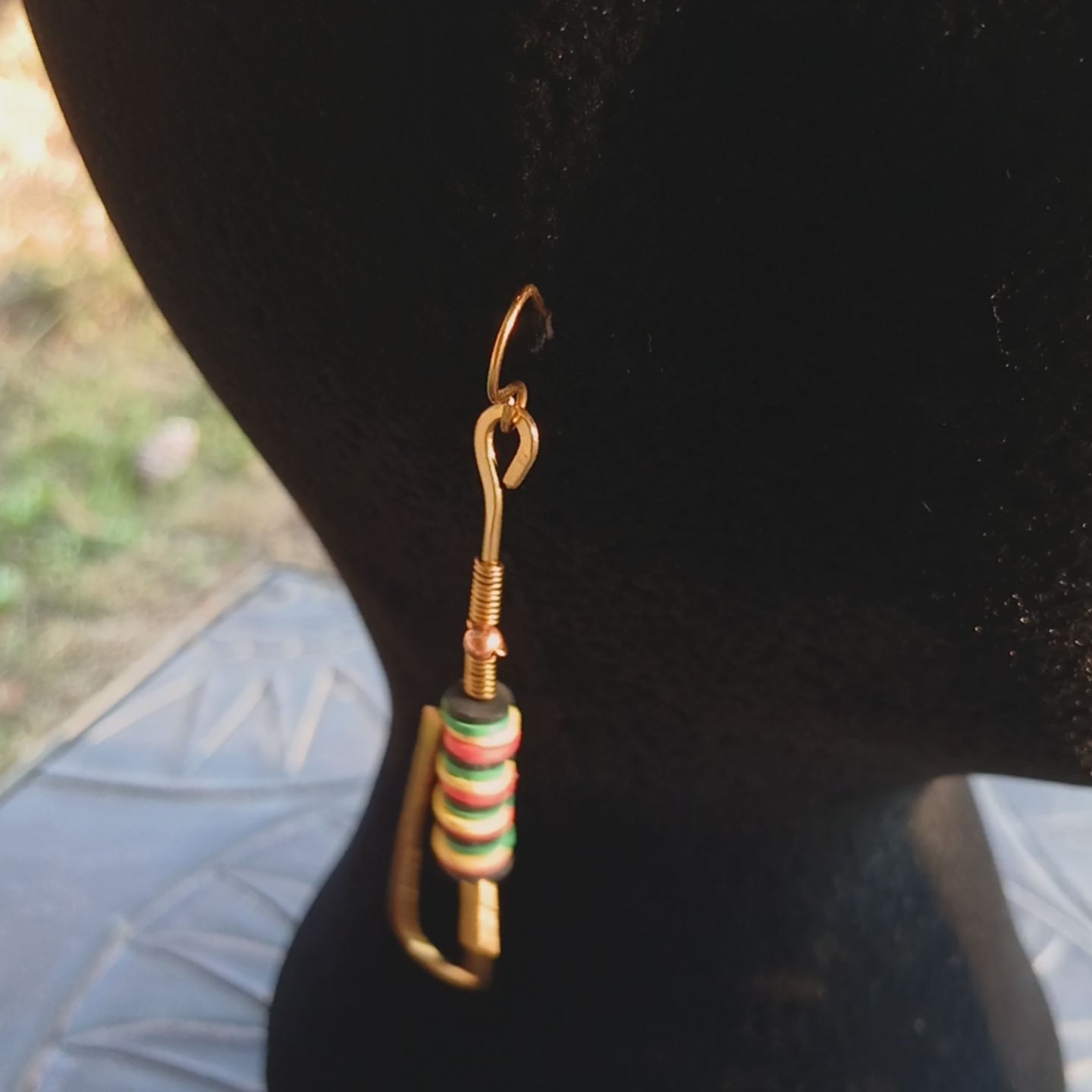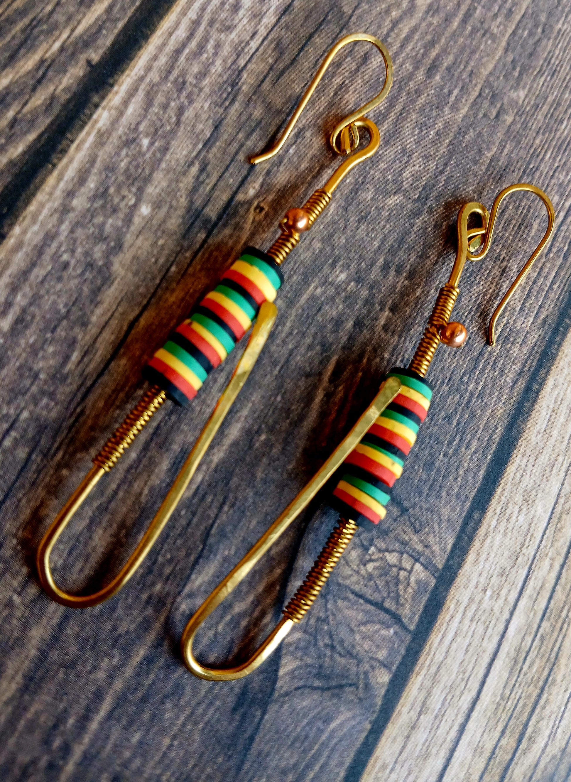 Earrings were entirely constructed by brass wire which was shaped and hammered giving the pair strength and fortitude. The delicate application of 24 gauge brass wire coil the neck and the base with cultural pride colors governing the middle. The spacer beads of: Black, Green, Yellow and Red are crowned with a petite, copper sphere.