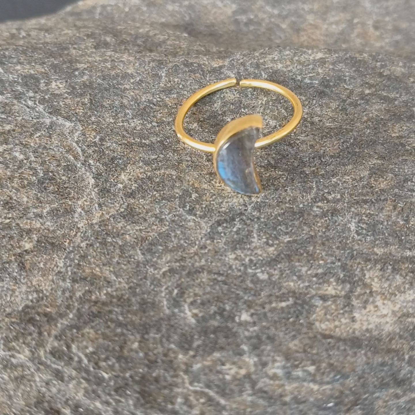 The elusive, lightning colors of the Labradorite crystal is thought of as the 'dream stone' bridging the gap between the physical to ethereal realms 💫. The interchanging colors can range from flashes of blue to grey. This petite, crescent moon ring is adjustable and crafted in brass; it can be stacked or left to sparkle alone.
