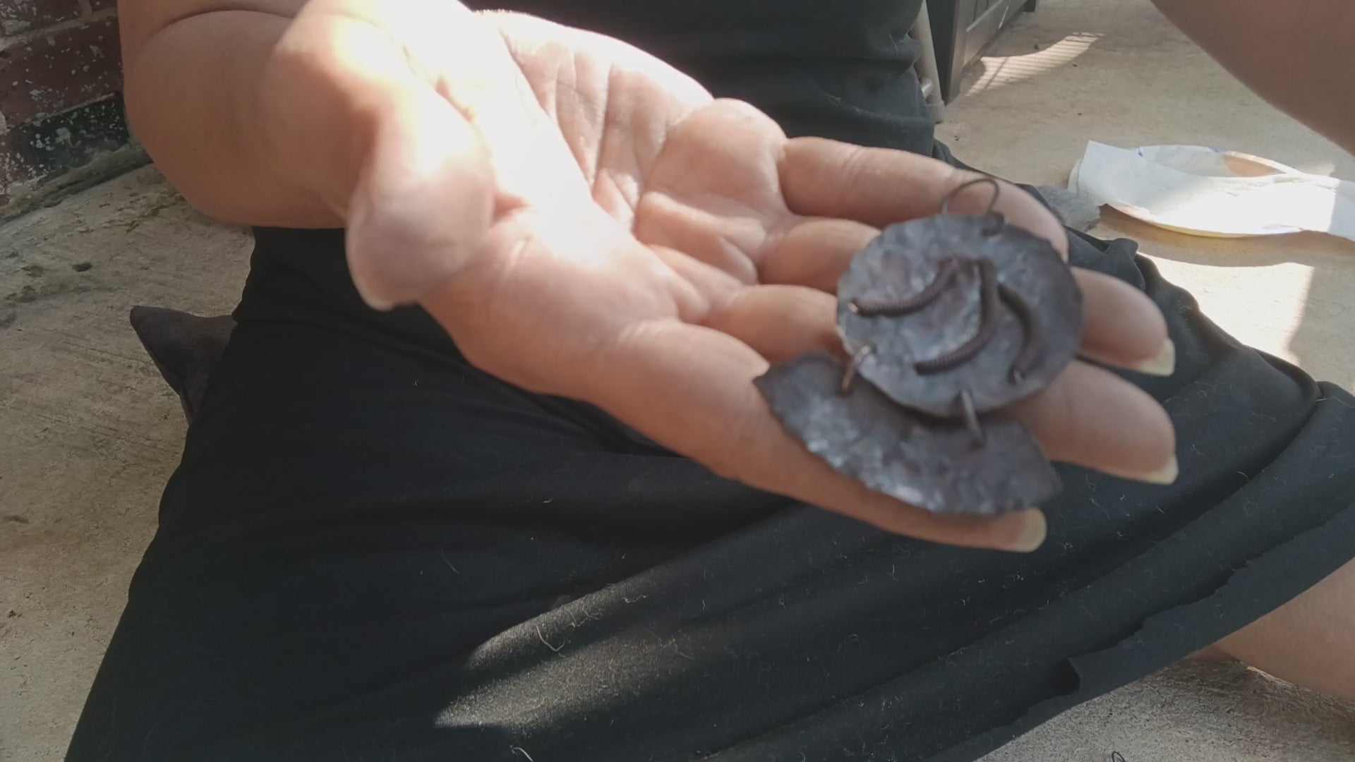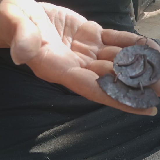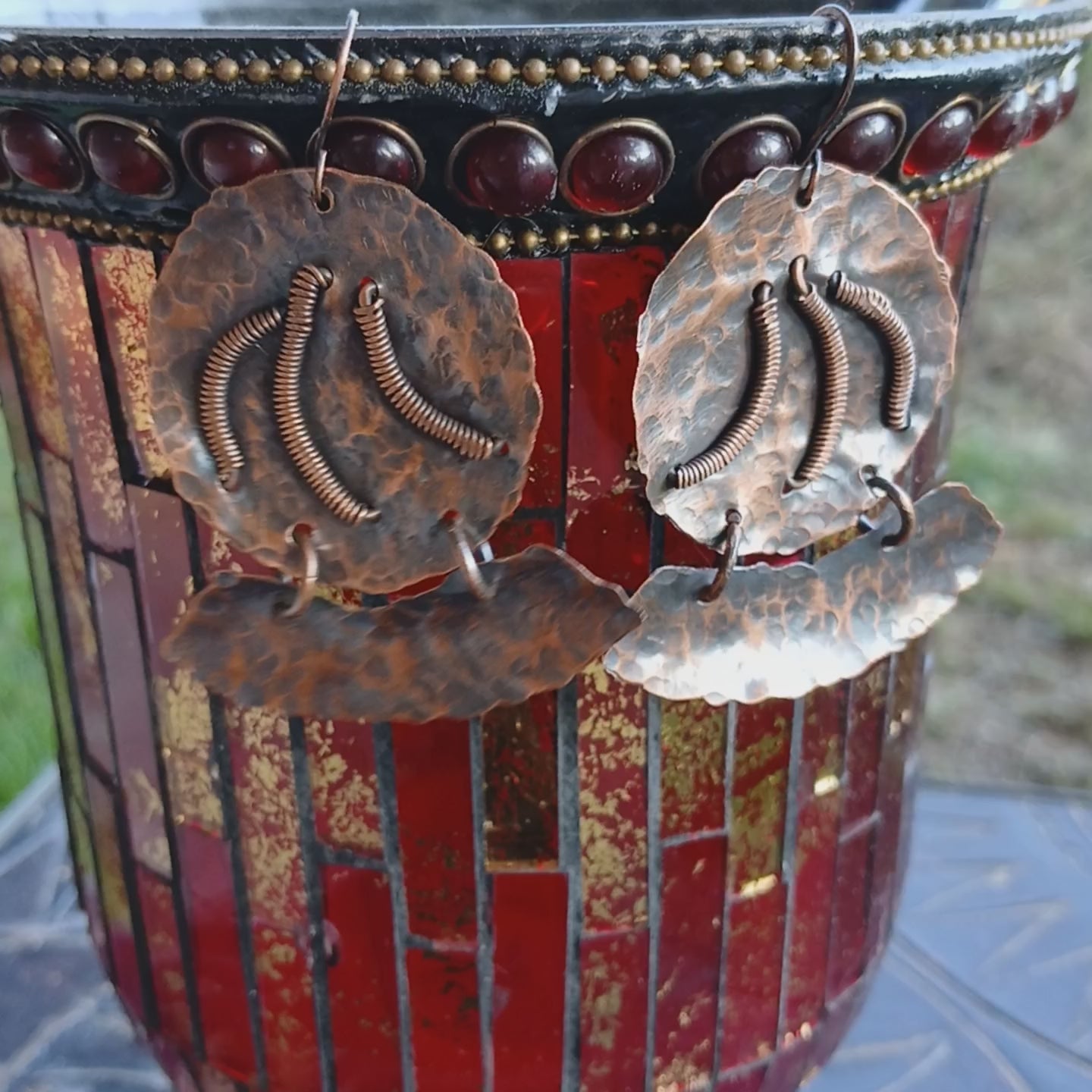 Every strike of the hammer — tink, tink, tink — breathes life into raw copper, coaxing it into becoming an earring that carries the soul of an ancient artifact. The process of this creation begins in the heart and then is birthed from the imagination. With the quality of antiquity, it has a warm, chocolate color that is neutral and easy to pair with many colors. Very light upon wearing, but not easy to get away...except for you.