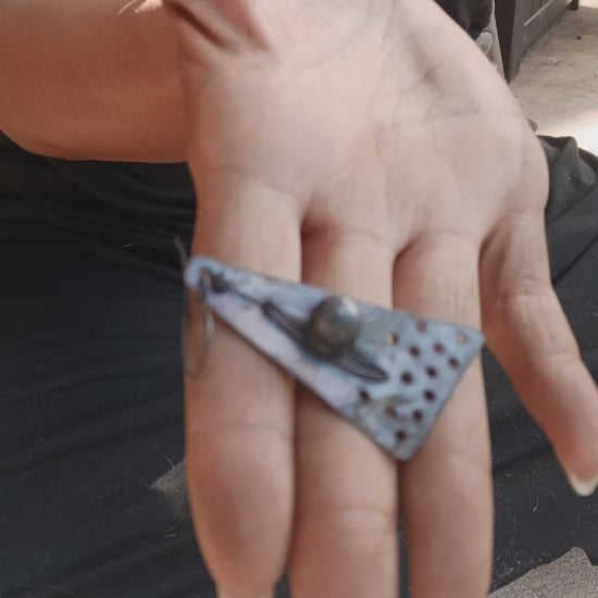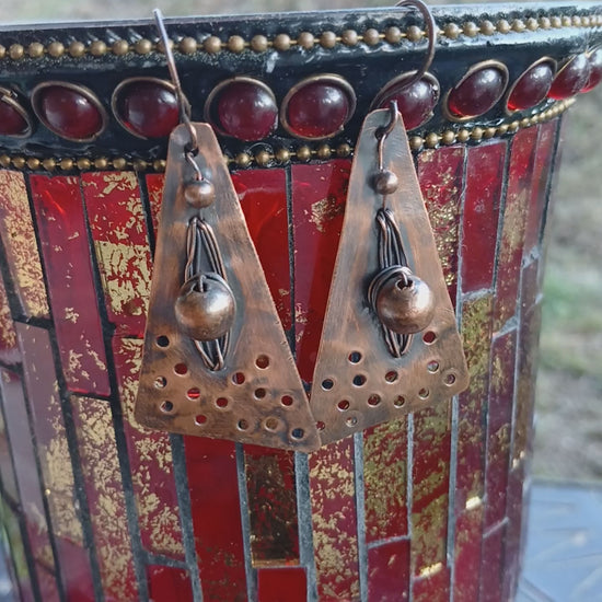 Every strike of the hammer — tink, tink, tink — breathes life into raw copper, coaxing it into becoming an earring that carries the soul of an ancient artifact. The style is sophisticated, postmodern and speaks life into feminine empowerment. The antique finish is a warm chocolate with hints of the beautiful rose gold color of copper shining through. Very light upon wearing, but not out of your grasp.