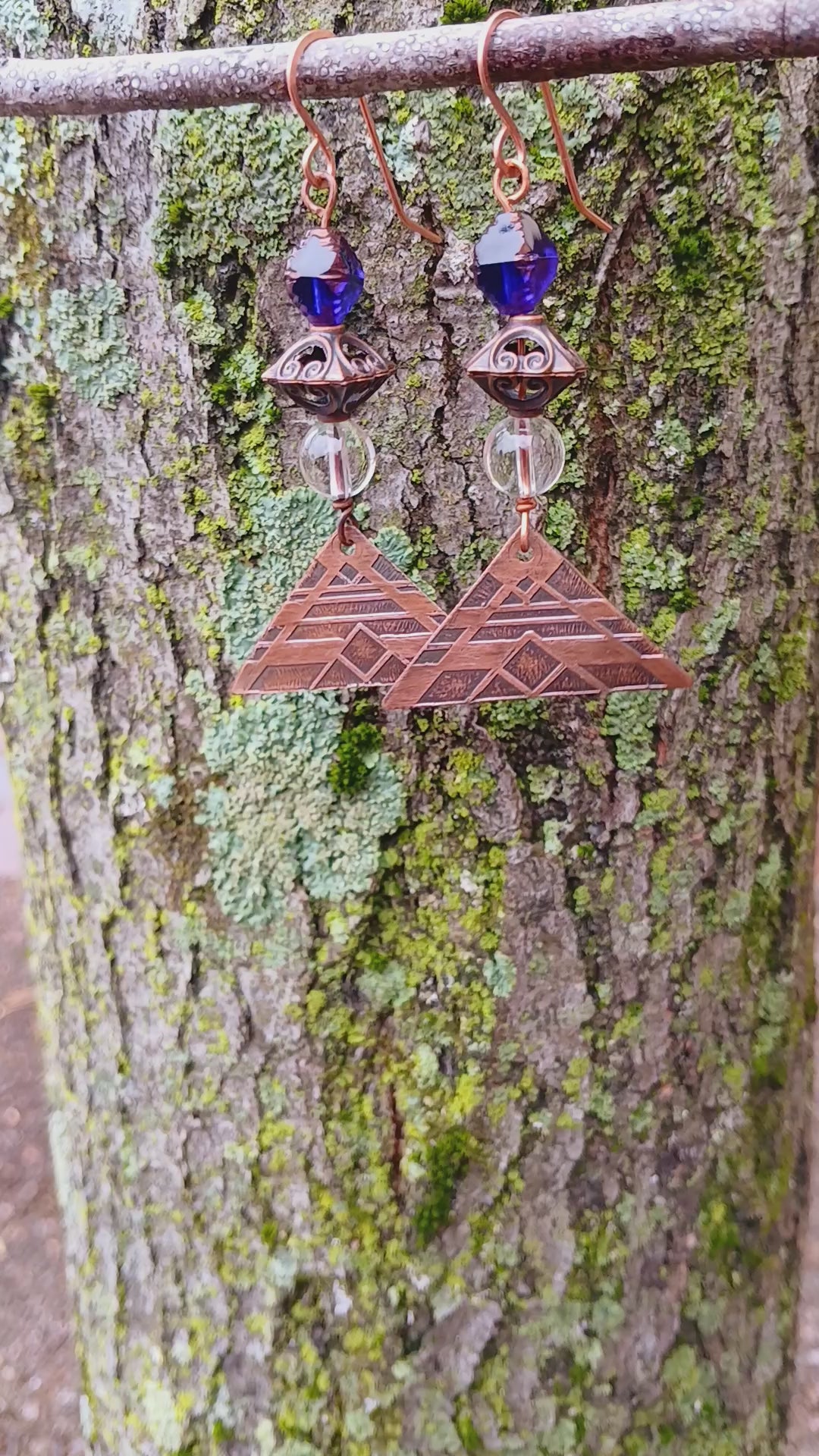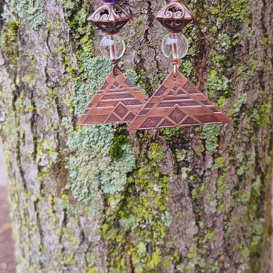 Copper Earrings-Etched with Clear Quartz & Deep Blue Glass
