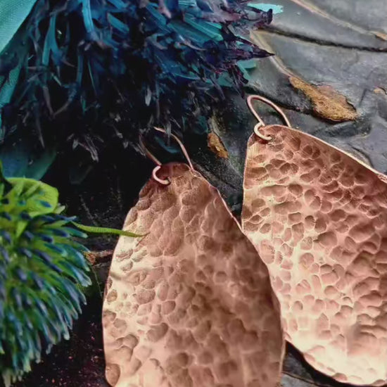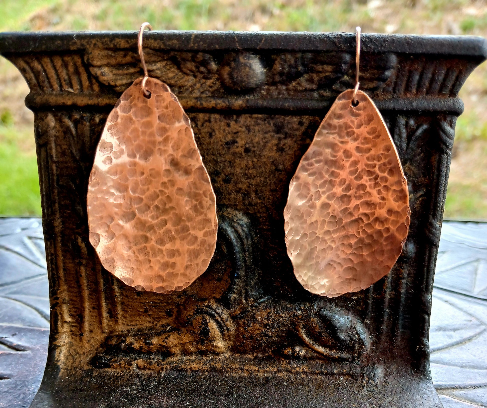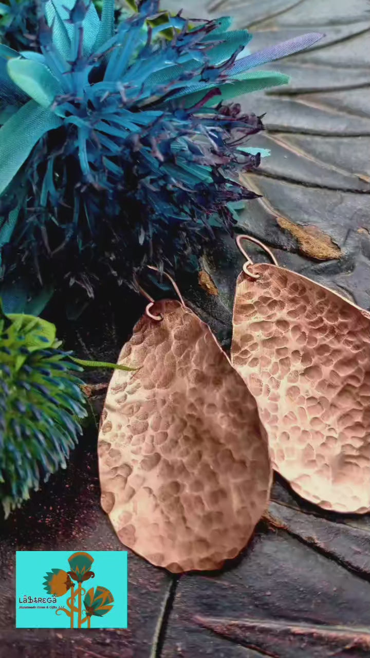 The ring of the hammer striking the metal sheet >Tink, tink, tink< resounding with the beat of my heart, the torch-rendered,smokey element-like the fires of passion. This pair was also lovingly crafted from raw materials: copper sheet, copper wire. The textured surface is reminiscent of an avocado, its shape, pear-like. Light, trendy and boho-stylish. Would pair beautifully with deep, rich tones like: navy, black, pine green or for a sophisticated look: linen, beige and grey.