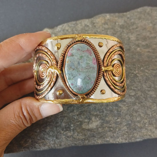 🫶🏽Fairtrade Item🫶🏽 Beautiful, adjustable, stainless steel cuff handcrafted by artisans in India. The spiral designs consist of brass and copper. The focal is a beautiful Ruby Fuschite stone nestled within a bezel then framed by intricate copper weaving. The studded-like accents look like rivets forged in and around the stone guiding your gaze upon its depths. It speaks, 'I am here'. It is a bolder piece. One that could compliment and complete the carefree, kindred spirit.