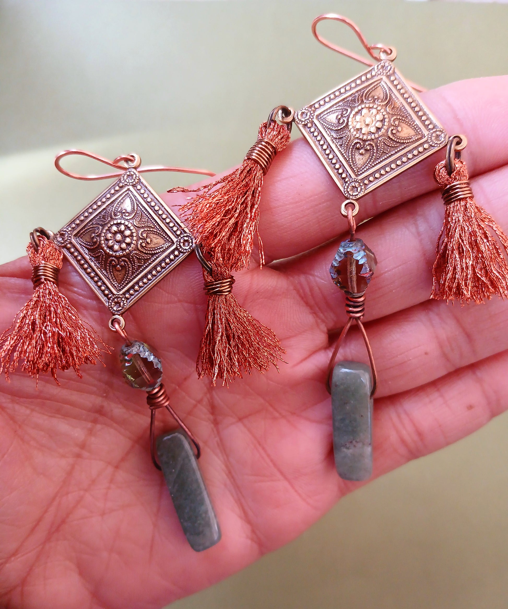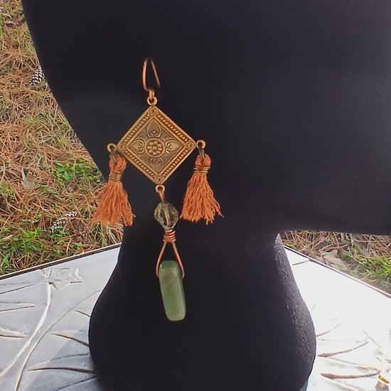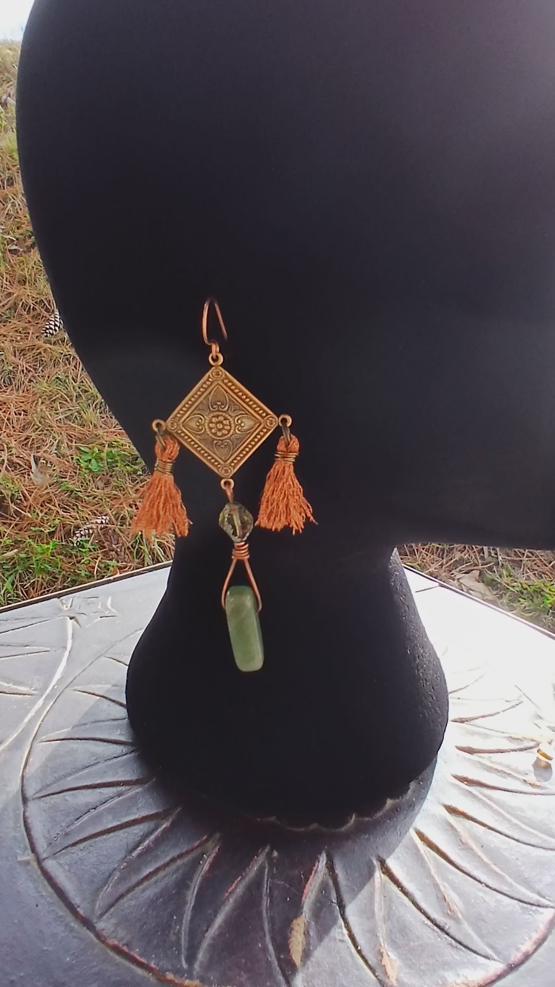 A dance of textures and light, these handcrafted earrings flow with artistry and intention. From a brass diamond descends a frame of raw brass wire, carrying the calm glow of a semiprecious aventurine stone. Between them rests a soft green Czech glass bead, a gentle shimmer of earth’s quiet beauty. Below, handspun tassels of embroidery floss sway with movement—threads of color spun into rhythm, carrying the spirit of craft and touch.