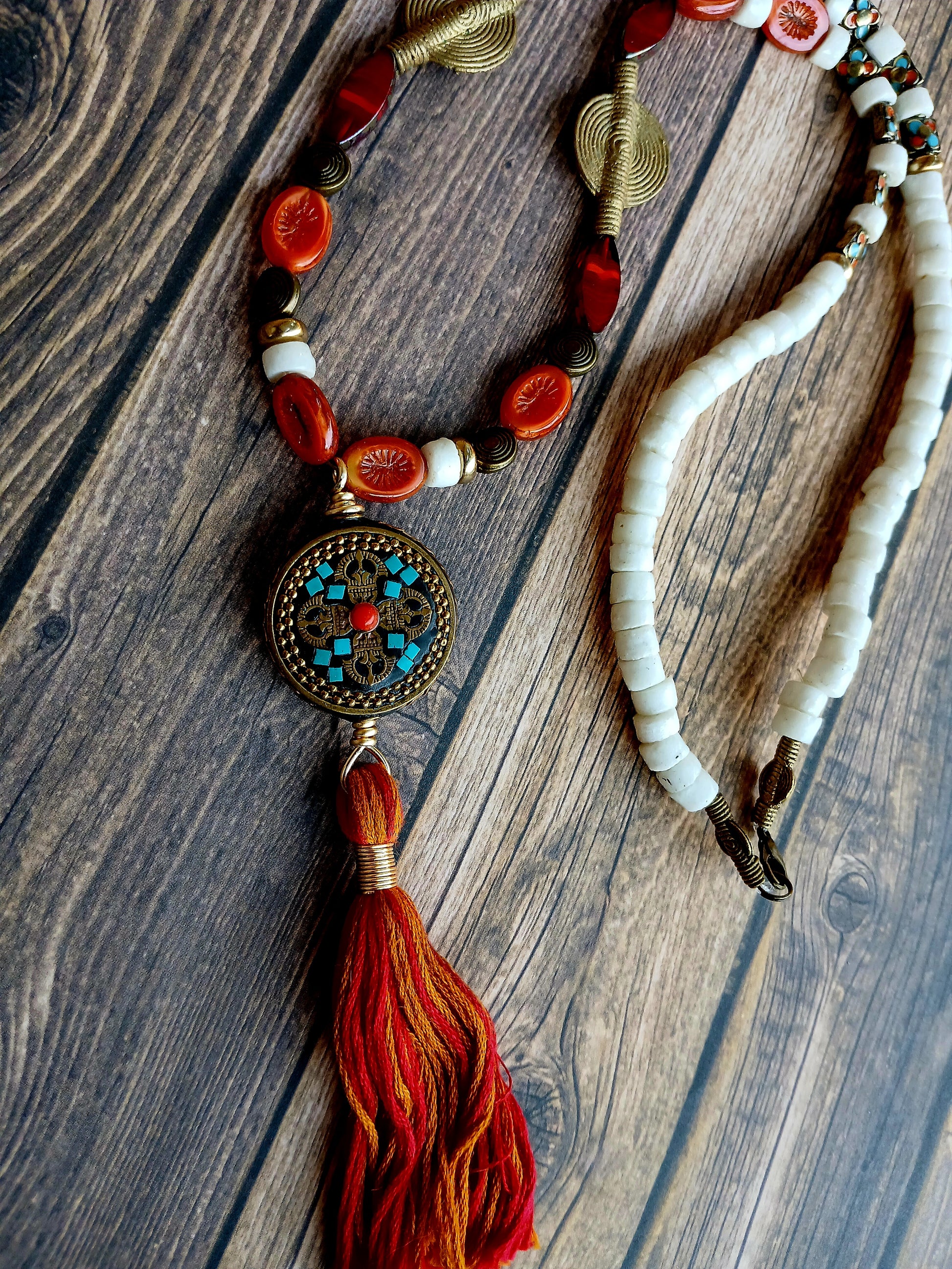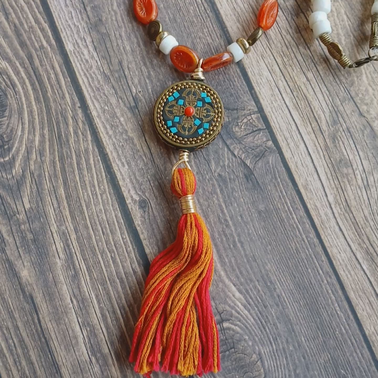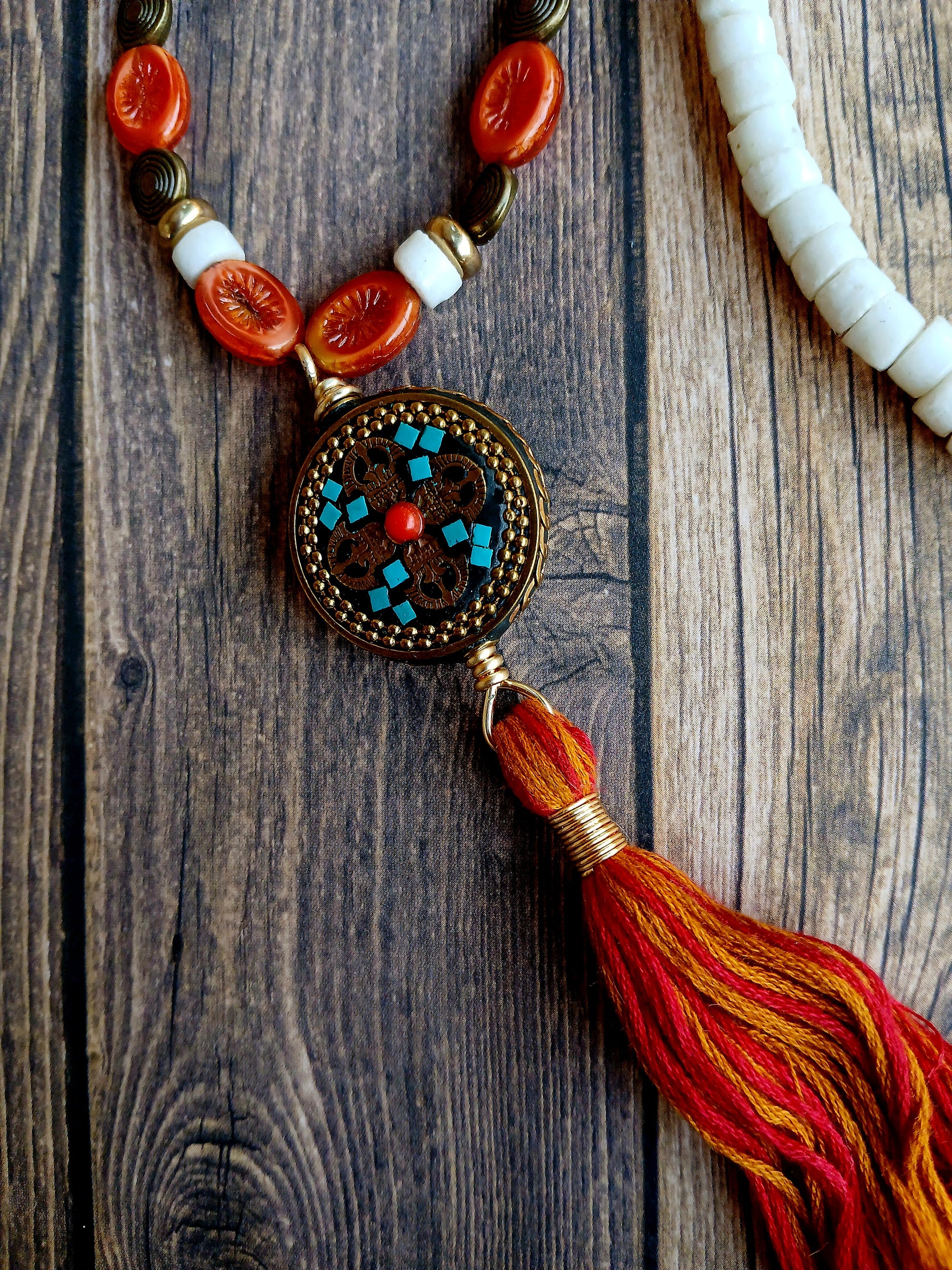 Ample length necklace with glass beads and a handspun tassle. Believing that beads 'speak' a language through rich color, texture and mood, this necklace became a fusion of beads from different parts of the world. A land not touched, a shrine where reverence is observed and demonstrated through silence. The passionate glow of orange and red are bold and exciting and bridged with a brass, sunburst bead. The soothing shades of blue intermingle with the grounding strength of brown. This statement necklace could inspire an interconnectedness within and without.