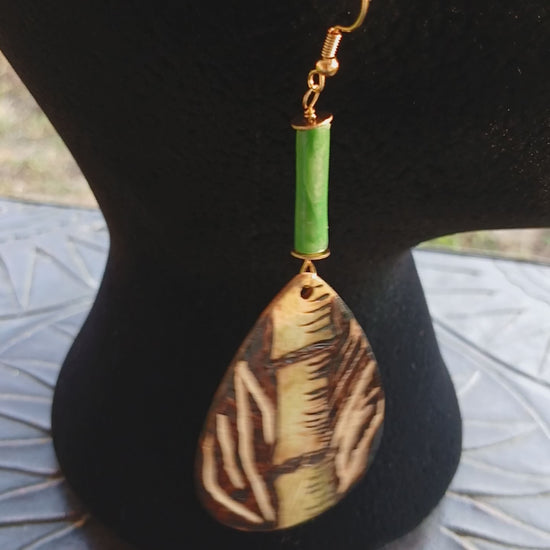 Unruly wood fiber is sanded away to reveal a buttery, smooth surface. Our canvas becomes more 'supple' to the kiss of the pyrographer's hot pen. A free-hand design is applied and becomes a map to guide the imagination into physical reality. Bamboo is sturdy and enduring, so we thought it befitting to cast this on to wood. The imagery becomes scorched and permanent. A tint of pale green paint is gently applied-as if the segments are simply blushing from the stroke of the brush. A carving tool was then used to reveal the bare wood underneath. Atop are handcrafted, clay beads resembling the jade stone. The depth of the green is as lush and vivacious as a bamboo forest. Small gold-plated Hematite spacer beads mimic the bamboo's segments.